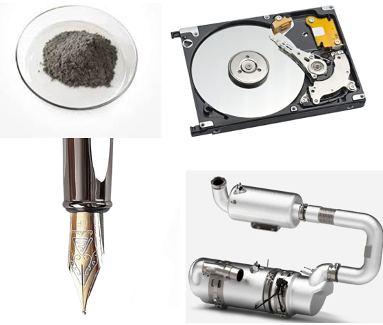 - 펜촉: 내구성을 높이기 위해 만년필 펜촉 합금에 사용되기도 합니다.